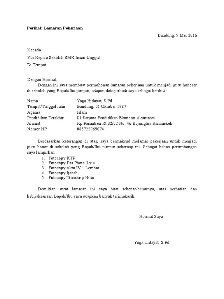 Lengkapi dengan daftar riwayat pendidikan, salinan atau fotocopi ijazah dan . Buat surat lamaran dengan tulisan tangan yang jelas dan rapi. Ketahui juga contoh surat keterangan domisili beserta cara membuatnya! Contoh surat lamaran kerja guru smp (honorer) · pas foto 3 x 4 cm 4 lembar · pas foto 4×6 cm 4 lembar · fotokopi ijazah terakhir yang telah dilegalisir 1 lembar . Contoh penulisan alamat penerima pada surat lamaran pekerjaan guru: